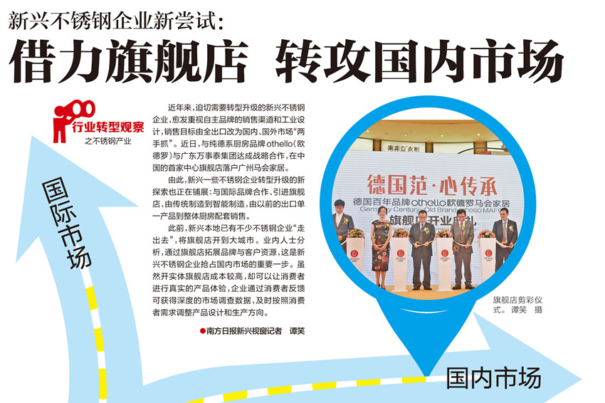 新興不銹鋼企業(yè)新嘗試:借力旗艦店 轉(zhuǎn)攻國(guó)內(nèi)市場(chǎng)近年來(lái),迫切需要轉(zhuǎn)型升級(jí)的新興不銹鋼企業(yè),愈發(fā)重視自主品牌的銷售渠道和工業(yè)設(shè)計(jì),銷售目標(biāo)由全出口改為國(guó)內(nèi)、國(guó)外市場(chǎng)“兩手抓”。近日,與純德系廚房品牌othello(歐德羅)與廣東萬(wàn)事泰集團(tuán)達(dá)成戰(zhàn)略合作,在中國(guó)的首家中心旗艦店落戶廣州馬會(huì)家居。由此,新興一些不銹鋼企業(yè)轉(zhuǎn)型升級(jí)的新探索也正在鋪展:與國(guó)際品牌合作、引進(jìn)旗艦店,由傳統(tǒng)制造到智能制造,由以前的出…