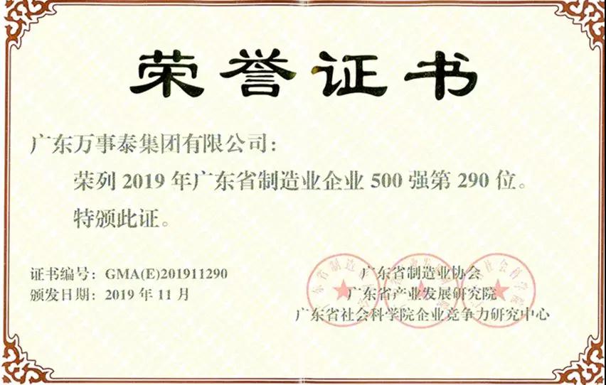 「喜訊」萬(wàn)事泰集團(tuán)再次入選廣東省制造業(yè)企業(yè)500強(qiáng)推薦