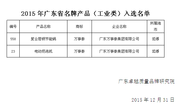 2015年最后一天,廣東萬(wàn)事泰集團(tuán)再傳捷報(bào)!由廣東卓越質(zhì)量品牌研究院主辦的廣東省名牌產(chǎn)品申報(bào)項(xiàng)目中,集團(tuán)申報(bào)名牌產(chǎn)品——“電動(dòng)奶泡機(jī)”和“復(fù)合層鋼節(jié)能鍋”雙雙入選廣東省名牌產(chǎn)品(工業(yè)類(lèi))初選名單。廣東萬(wàn)事泰集團(tuán)以?xún)煽钊赂拍睢㈩I(lǐng)先品質(zhì)的產(chǎn)品,兩款產(chǎn)品設(shè)計(jì)新穎,功能全面,入選廣東省名牌可以算是實(shí)至名歸。至此,在“互聯(lián)網(wǎng)+”的趨勢(shì)浪潮之下,萬(wàn)事泰集團(tuán)積極開(kāi)拓國(guó)內(nèi)外市場(chǎng)的品牌戰(zhàn)役已經(jīng)打響,包括收購(gòu)德國(guó)著名品牌Othello以及開(kāi)發(fā)Momscook等自主品牌,產(chǎn)品品牌矩陣已呈全面鋪開(kāi)之勢(shì),極大力度地提升名牌產(chǎn)品份額以及品牌附加值,為集團(tuán)“創(chuàng)一流品牌,建百年企業(yè)”這一宏愿再夯基石。