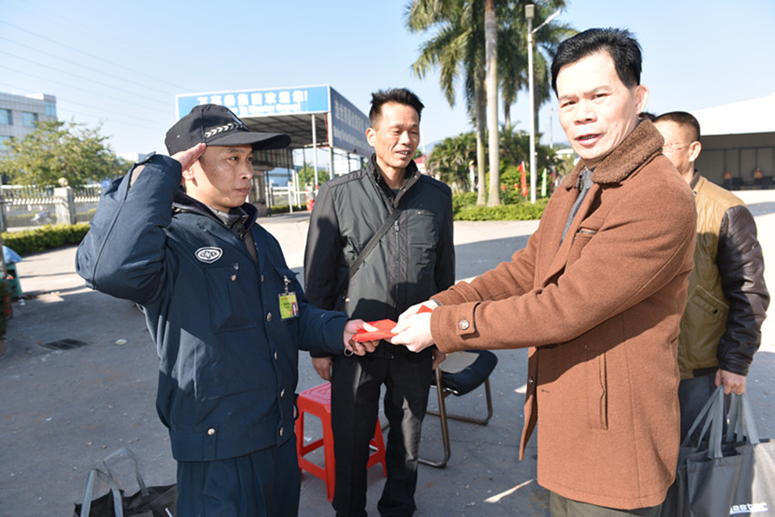 集團(tuán)訊 吉祥如意年初一,歡天喜地過猴年。2月8日上午,萬事泰集團(tuán)黨支部書記陳永錦、行政部副經(jīng)理陳煥文、總裁辦助理歐劍華一行,對(duì)新春佳節(jié)仍然堅(jiān)守值班的集團(tuán)工作人員進(jìn)行春節(jié)慰問,他們代表集團(tuán)為值班人員帶去豐厚的新春禮物和慰問金,送上真摯的祝福和問候。