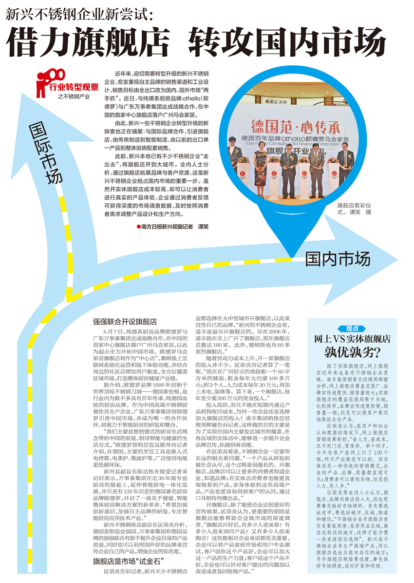 區(qū)榮炎告訴記者,新興不少不銹鋼企業(yè)都選擇在大中型城市開旗艦店,以此來宣傳自己的品牌。“新興的不銹鋼企業(yè)里,凌豐是最早開旗艦店的。早在2006年,凌豐就在北上廣開了旗艦店,現(xiàn)在旗艦店總數(shù)達180家。此外,德納斯也有60多家的旗艦店?!?