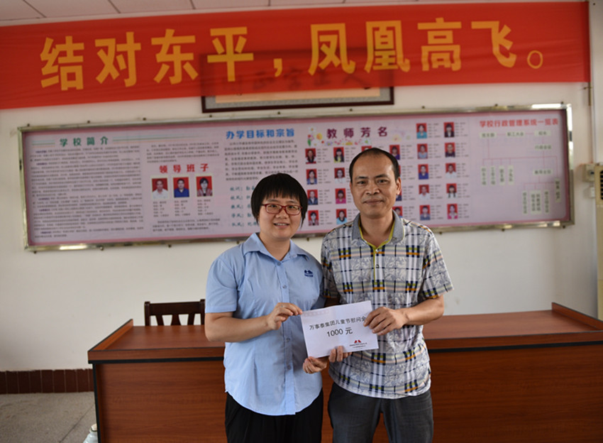萬(wàn)事泰集團(tuán)員工代表將慰問(wèn)金交付給王香地小學(xué)師生手中,并與大家親切的合影留念。