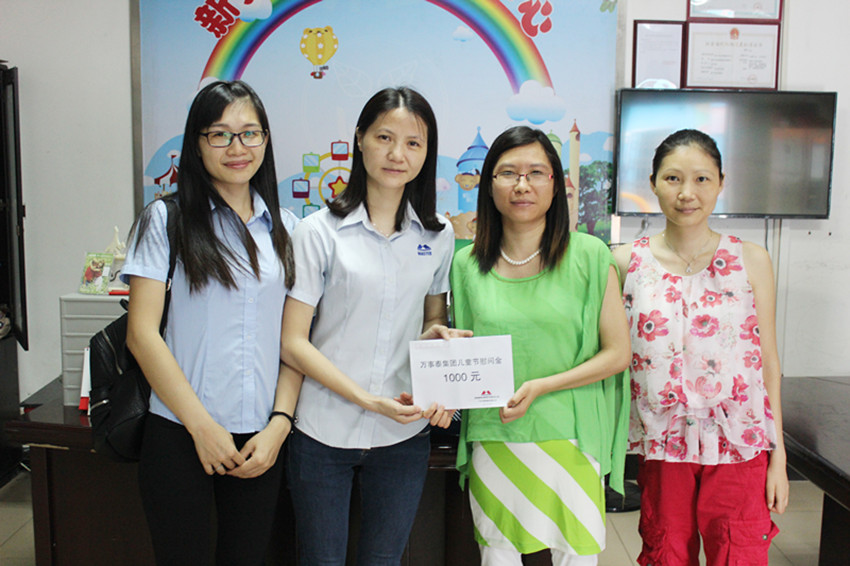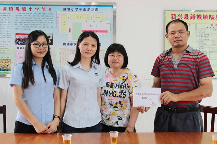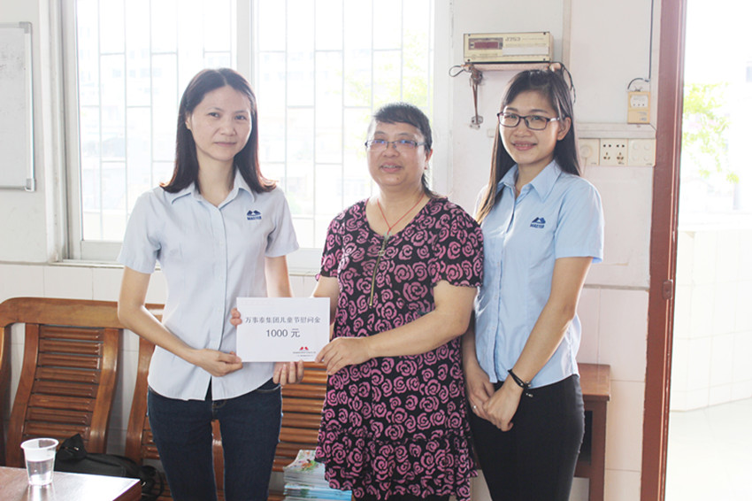 集團(tuán)訊 時(shí)值六一兒童節(jié)到來(lái)之際,2016年5月27日下午,萬(wàn)事泰集團(tuán)工會(huì)、行政部以及企業(yè)文化部工作人員前往新興縣內(nèi)5所外來(lái)工子女就讀小學(xué)慰問(wèn),集團(tuán)代表與孩子們開(kāi)心的分享節(jié)日的快樂(lè),送去慰問(wèn)金,并與孩子們合影留念。