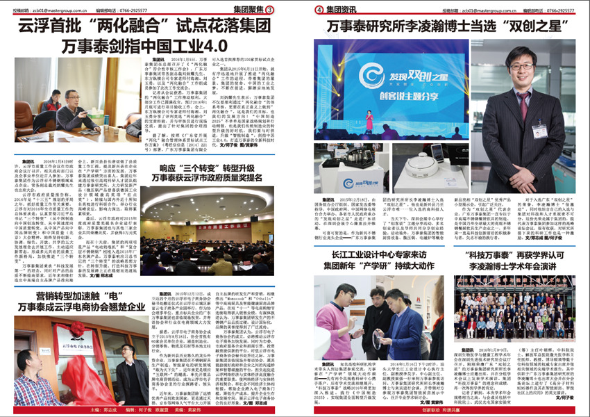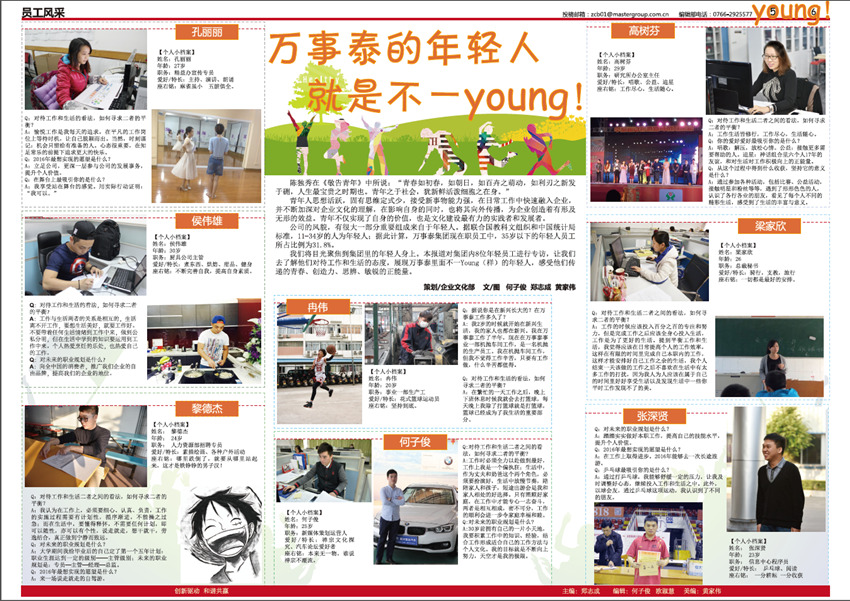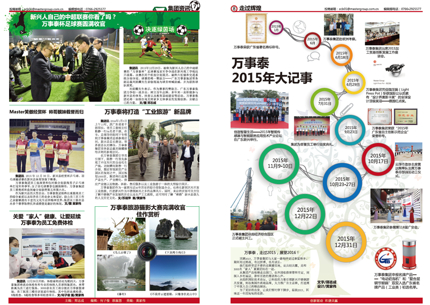 《萬(wàn)事泰》是廣東萬(wàn)事泰集團(tuán)的企業(yè)月報(bào),由集團(tuán)企業(yè)文化部負(fù)責(zé)編輯出版,在部門(mén)同事鄭志成、歐淑慧、何子俊、黃家偉、黎家良的協(xié)作努力下,在集團(tuán)領(lǐng)導(dǎo)、員工的鞭策和支持下,不斷將內(nèi)刊從選題策劃、欄目設(shè)置、稿件標(biāo)準(zhǔn)、版式設(shè)計(jì)上進(jìn)行升級(jí)改進(jìn),為廣大萬(wàn)事泰員工奉獻(xiàn)一份“從一線來(lái)、到一線去”的接地氣的內(nèi)刊報(bào)紙,建設(shè)成企業(yè)內(nèi)部資訊上傳下達(dá)的暢通平臺(tái),傳遞實(shí)用有趣、積極向上的資訊內(nèi)容和集團(tuán)理念,助力集團(tuán)的蓬勃發(fā)展。