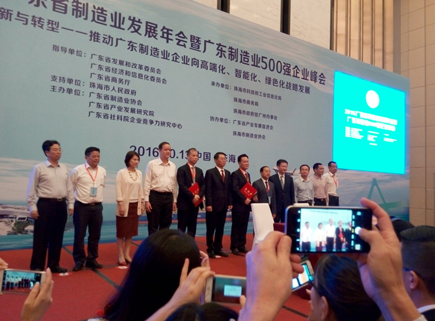 集團(tuán)訊 創(chuàng)新與轉(zhuǎn)型——推動(dòng)廣東制造業(yè)企業(yè)想高端化、智能化、綠色化戰(zhàn)略發(fā)展,一語(yǔ)概括了制造業(yè)未來(lái)發(fā)展的新方向。10月13日上午,2016年度廣東省制造業(yè)發(fā)展年會(huì)暨制造業(yè)500強(qiáng)企業(yè)峰會(huì)在珠海會(huì)展中心召開(kāi)。在2016年度省制造業(yè)企業(yè)500強(qiáng)評(píng)選中,萬(wàn)事泰集團(tuán)強(qiáng)勢(shì)上榜,排名296位。集團(tuán)執(zhí)行總裁劉炳耀、總裁助理歐劍華出席會(huì)議。