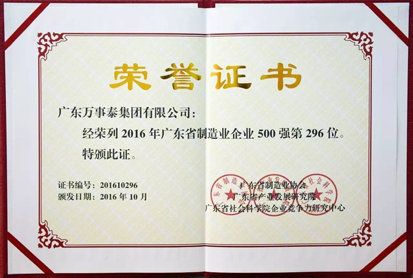 萬(wàn)事泰集團(tuán)上榜廣東省制造業(yè)500強(qiáng)。