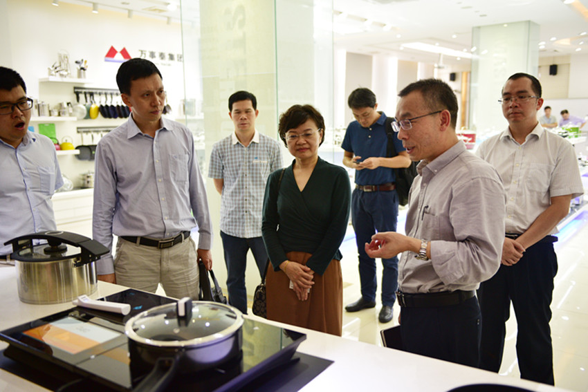 隨后,調(diào)研組一行來到了萬事泰智能廚房展廳。參觀期間,劉炳耀詳細(xì)介紹了集團(tuán)的廚具產(chǎn)品和小家電產(chǎn)品。萬事泰研究所經(jīng)理何榮佳向調(diào)研組一行講解了萬事泰自主研發(fā)的智能烹飪臺E-cook table和帶有溫度傳感器的不粘鍋,為調(diào)研組一行展示了萬事泰科技創(chuàng)新轉(zhuǎn)型升級的新產(chǎn)品和新方向。調(diào)研組對萬事泰智能廚房非常感興趣,都紛紛給予了充分的肯定。其中,王月琴還深入了解萬事泰的新產(chǎn)品研發(fā)方向、理念以及車間自動(dòng)化生產(chǎn)情況兩方面內(nèi)容。