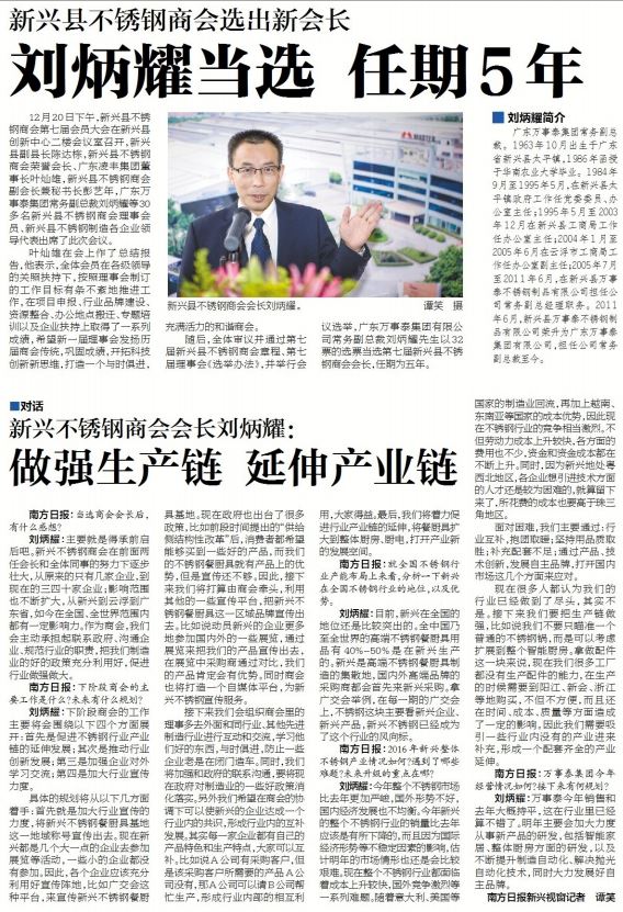2016年12月20日下午3時許,新興縣不銹鋼商會第七屆會員大會在新興縣創(chuàng)新中心二樓會議室日常召開,新興縣副縣長陳達棟,新興縣不銹鋼商會榮譽會長、廣東凌豐集團董事長葉燦雄,新興縣不銹鋼商會副會長兼秘書長彭藝年、副秘書長馮婉萍,廣東萬事泰集團常務(wù)副總裁劉炳耀等30多名新興縣不銹鋼商會理事會員、新興縣不銹鋼制造各企業(yè)領(lǐng)導(dǎo)代表出席會議。