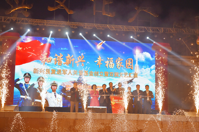 領(lǐng)導(dǎo)們?nèi)w手扶拉桿,在市委副書(shū)記、政法委書(shū)記袁錦權(quán)宣布:新興縣復(fù)退軍人關(guān)愛(ài)基金正式創(chuàng)立”聲音中同時(shí)推下拉桿,燃放煙花,噴起噴泉。