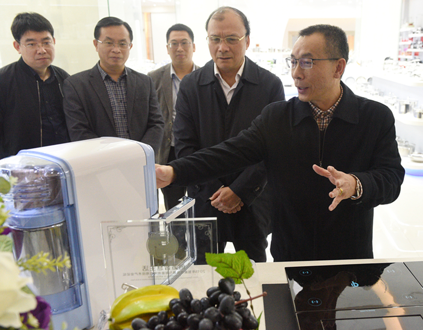 劉總給調(diào)研團(tuán)介紹新產(chǎn)品智能沖奶機(jī)
