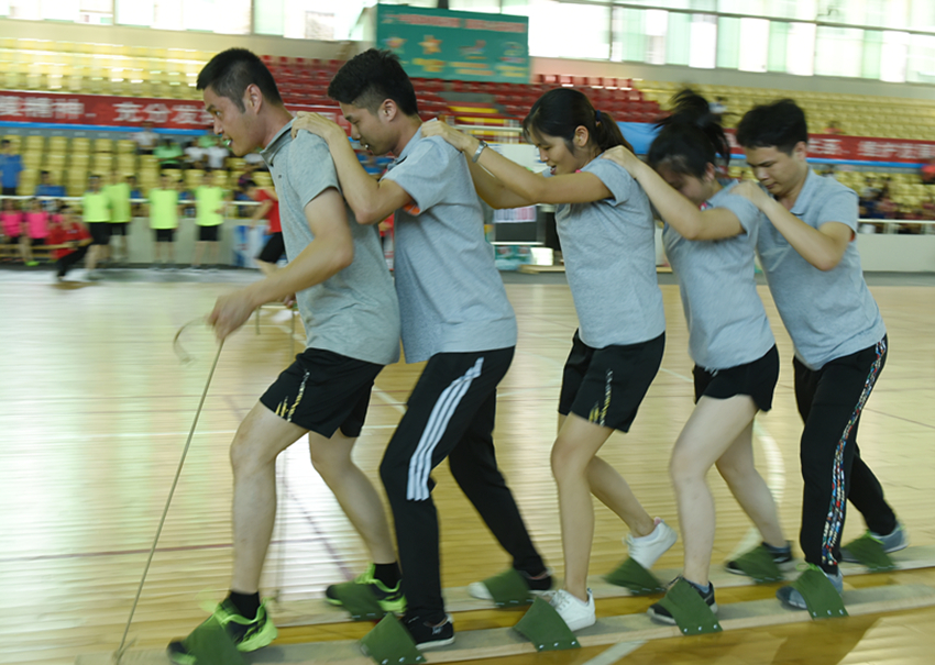 在裁判長的一聲“哨”令下,六項比賽項目井然有序地開展起來。在“齊心協(xié)力”的比賽中,萬事泰集團員工們的表現(xiàn)最為突出,只見5名隊員列成一排,雙腳站在協(xié)力競走器上,順著“一二、一二...”的口號拍子,同心協(xié)力地向著起點的另一邊奮進。