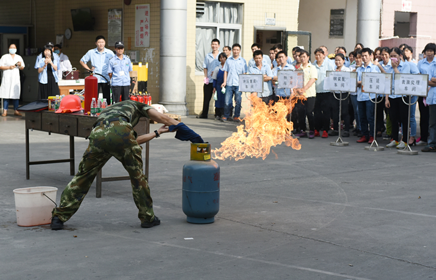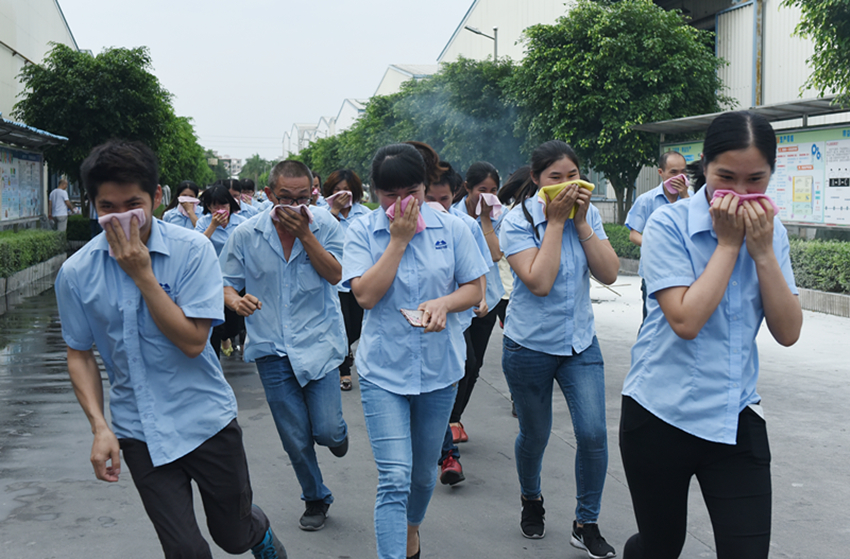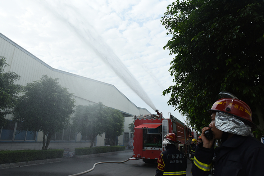 在演習(xí)的過程中,新興縣消防官兵針對火災(zāi)事故發(fā)生時的情況講解了各種滅火器材的性能、用途和使用方法,并實操演習(xí)了車間現(xiàn)場火災(zāi)撲救。隨后,全廠員工在疏散組的指揮下井然有序地按照規(guī)定疏散路線,迅速撤離了現(xiàn)場,到達(dá)指定地點。