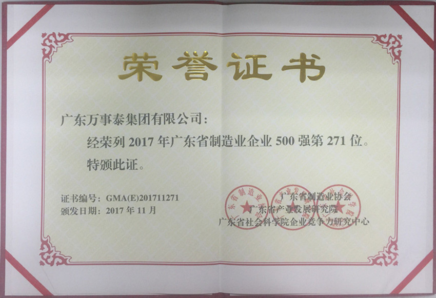 萬(wàn)事泰集團(tuán)上榜廣東省制造業(yè)500強(qiáng)。