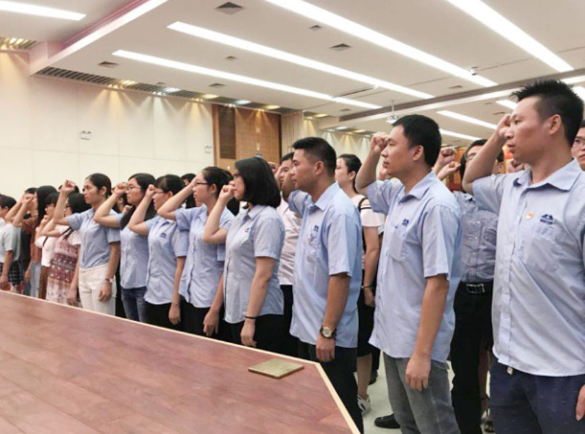 宣誓儀式上,預(yù)備黨員們精神抖擻,右手緊握拳頭,保持立正姿勢(shì),在縣委組織部副部長(zhǎng)、縣直工委書記蘇佐英的領(lǐng)誓下,面向黨旗宣誓,誓言激昂而響亮。儀式當(dāng)天,萬(wàn)事泰集團(tuán)預(yù)備黨員統(tǒng)一穿著廠服佩戴黨徽,整個(gè)宣誓隊(duì)伍生機(jī)勃勃,體現(xiàn)了萬(wàn)事泰集團(tuán)積極向上的企業(yè)精神。