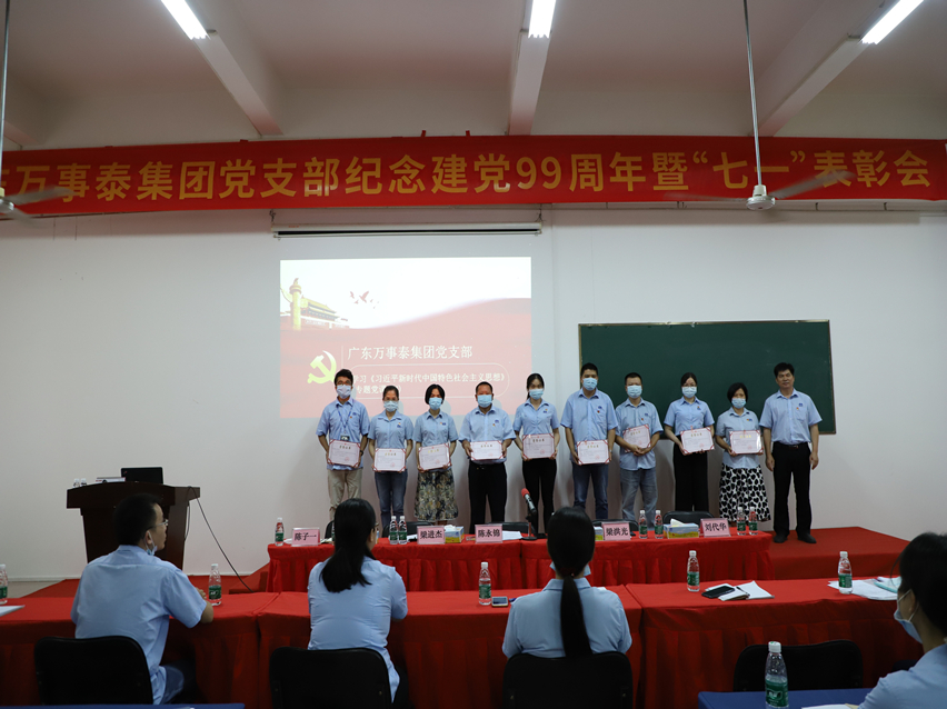 集團訊 7月25日,萬事泰集團黨支部在總部飯?zhí)萌龢桥嘤?xùn)室召開慶祝建黨99周年暨表彰大會,集團全體黨員參加會議,會議由黨支部書記陳永錦同志主持。