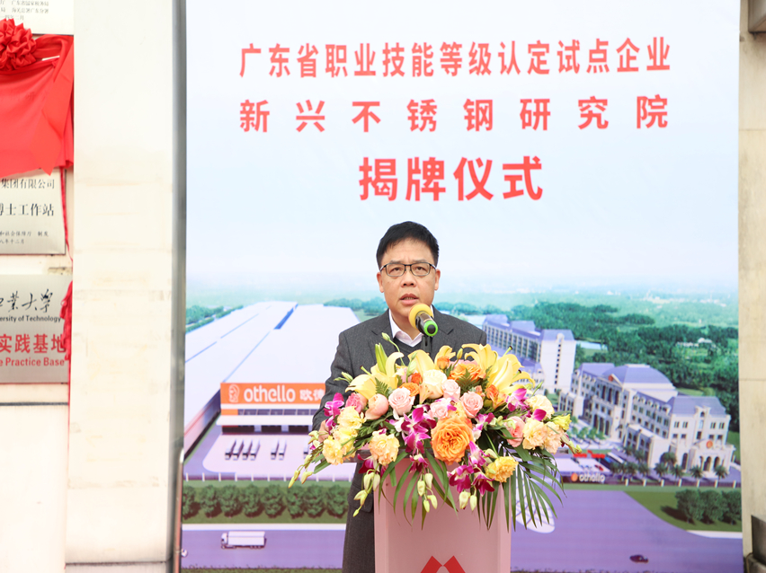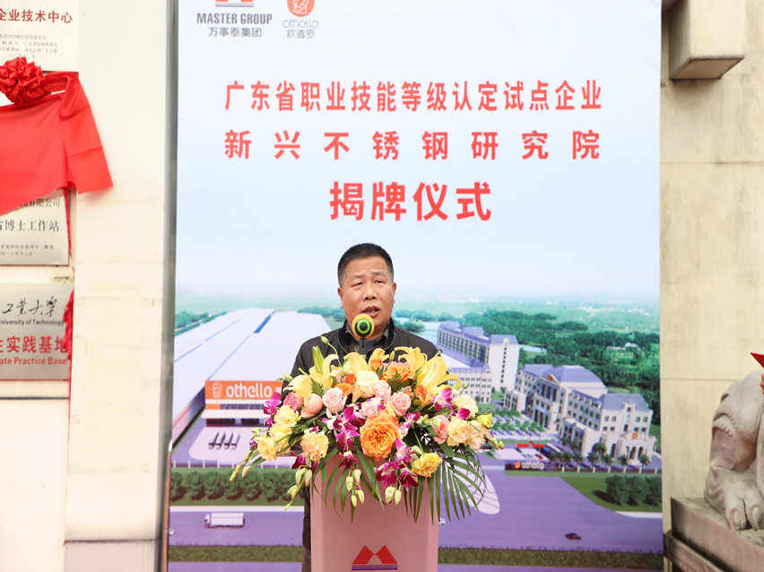 萬事泰集團執(zhí)行總裁劉炳耀首先向在百忙中抽空出席本次儀式的領(lǐng)導(dǎo)、嘉賓表示歡迎和感謝。他表示,“順利申報成為廣東省職業(yè)技能等級認(rèn)定試點企業(yè),以及成立新興不銹鋼研究院是萬事泰集團向著高質(zhì)量發(fā)展的兩項重要標(biāo)志。作為云浮唯一的職業(yè)技能等級認(rèn)定試點企業(yè),我們將持續(xù)加強認(rèn)定工作的科學(xué)化、規(guī)范化,進一步提升企業(yè)技能人才的水平,助力云浮、新興的技能人才隊伍建設(shè)發(fā)展。同時,承載著各級領(lǐng)導(dǎo)和社會各界的支持、關(guān)懷,新興不銹鋼研究院落戶萬事泰集團,這是對萬事泰研發(fā)實力的認(rèn)可,也是對萬事泰的期望,我們將以此為鞭策,充分發(fā)揮研究院的能動性,加快企業(yè)創(chuàng)新升級,以點帶面,促進行業(yè)的創(chuàng)新發(fā)展,為新興不銹鋼餐廚具產(chǎn)業(yè)的轉(zhuǎn)型升級凝聚核心競爭力作出積極貢獻?!?