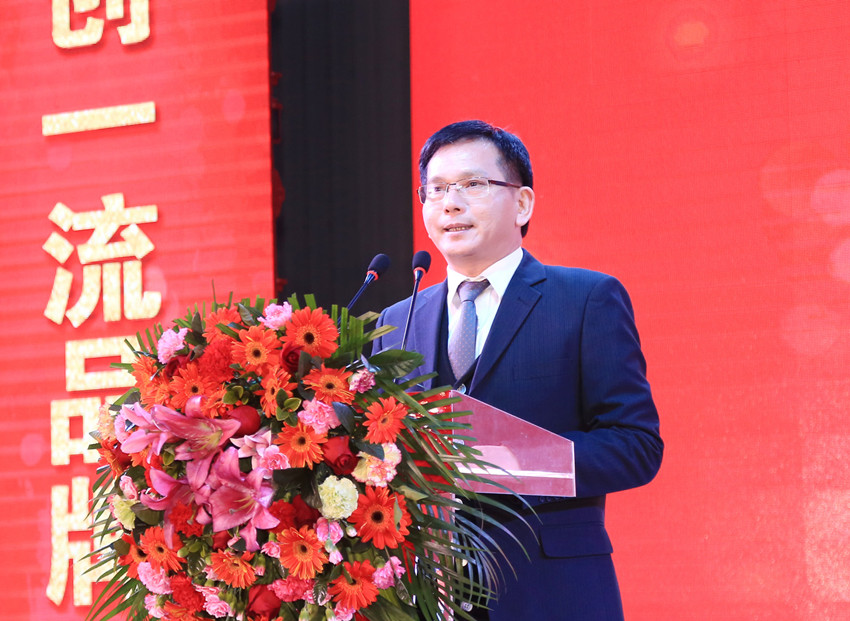 萬事泰集團董事長梁桂泉作晚會致辭,給大家?guī)硇履甑膯柡蚺c祝福。