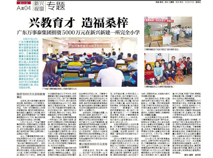2014年12月,新州教育基金會成立,主要對優(yōu)秀大學(xué)生進(jìn)行獎勵,萬事泰集團(tuán)第一時間捐資200萬元,給予大力支持;2012年萬事泰集團(tuán)獨家贊助第五屆六祖文化節(jié)贊助款198萬元;2014年萬事泰集團(tuán)捐資40多萬元用于改建王香地小學(xué)的牌坊、校門、值班房、圍墻、中心校道、校園廣場磚、樓梯地磚等修繕工程,并配置了1間可容納40名學(xué)生上課的電腦室。