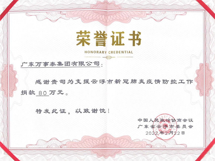 廣東萬事泰集團(tuán)是市政協(xié)委員企業(yè),在今年初共同面對突發(fā)輸入性新冠疫情防控中,積極參與市、縣共同抗疫,響應(yīng)市政協(xié)的倡議,愛心捐資80萬元支援云浮市新冠肺炎疫情防控工作,用實際行動助力疫情防控,為打好打贏疫情防控殲滅戰(zhàn)貢獻(xiàn)企業(yè)力量。